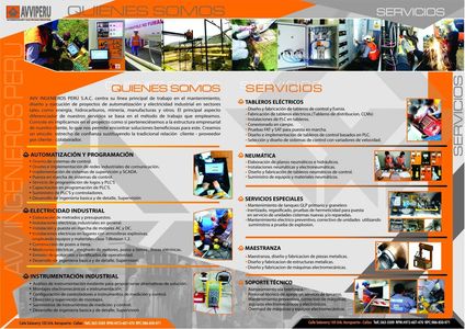 AVV INGENIEROS PERÚ S.A.C. centra su línea principal de trabajo en el mantenimiento, diseño y ejecución de proyectos de automatización y electricidad industrial en sectores tales como energía, hidrocarburos, minería, manufacturas y otros.